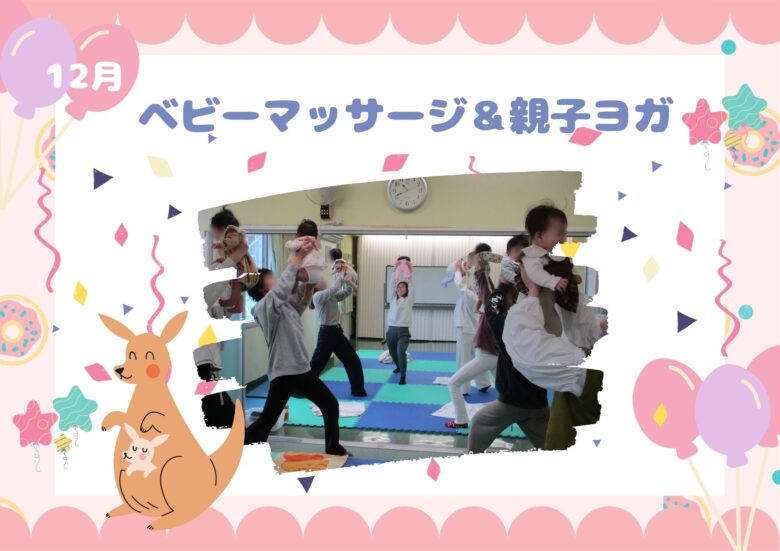 <レポート>ベビーマッサージ&親子ヨガ(12月) 投稿日 2025年12月20日 著者 nishiyodo カテゴリー プラザ抽選結果&レポート 開催日2025/12/9時間10:00~11:00講師IHTA公認 チャイルドボディセラピスト 西田 友子 氏参加者9組 計20名(乳幼児9名 保護者9名 一時保育2名)12月9日にベビーマッサージ&親子ヨガの講座がおこなわれました。この日は9組のご家族が参加されました。その中でも「今回が初めての参加」という方が4組おられ、お子さんが10か月になったので「今回で最後」になる方が1組おられました。お子さんのマッサージが終わると今度は親子でのヨガです、その中でも身体を伸ばすところはいつもみなさんに好評で今回も「久しぶりに身体を伸ばしました」という方が数名おられました。身体を伸ばすだけでも気分は変わりますよ。ぜひ一度体験してみてください。次回は1月13日です。