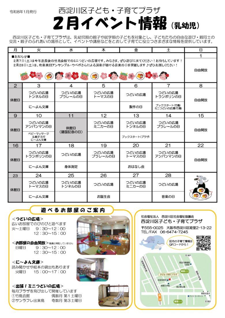 2026年2月号プラザだより 投稿日 2026年1月30日 著者 nishiyodo カテゴリー お知らせ カテゴリー プラザだより 2月のプラザだよりをアップしました。子ども・子育てプラザや各子育て支援施設、区役所等でも配布しています。ぜひ、お立ちよりください♪ イベント情報(乳幼児) 202602_tudoiダウンロード イベント情報(小中高生) 202602_jidoダウンロード