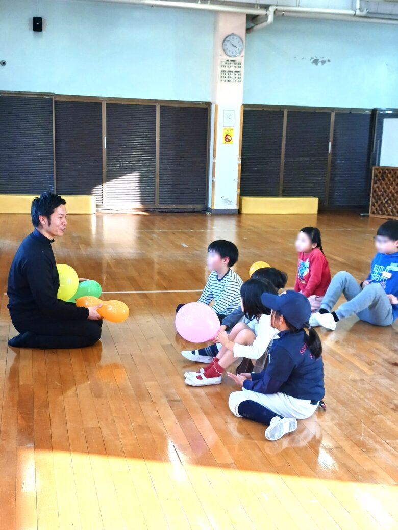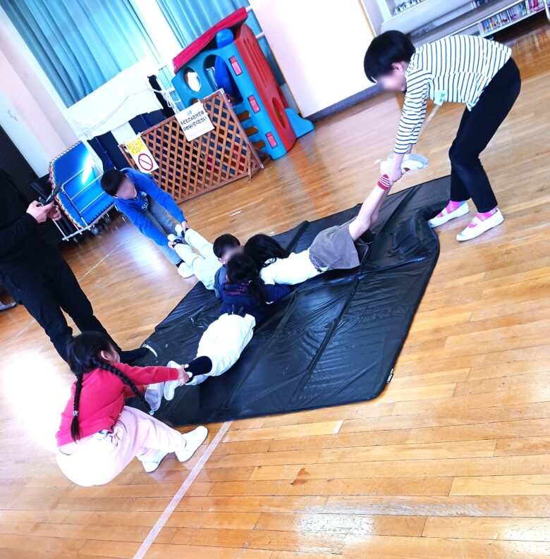 スポーツの基礎となる動きやチームワークを育てることを遊びながら学びました。全員が力を合わせてマットに乗るゲーム、マットチャレンジゲームが盛り上がり、最後には10秒停止を成功することが出来ました。仲間と体を動かすことで、楽しい体験ができました。