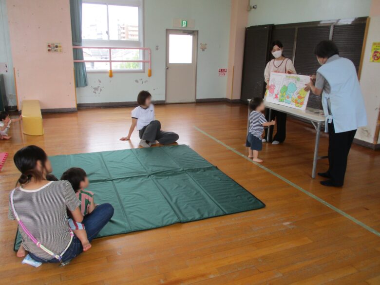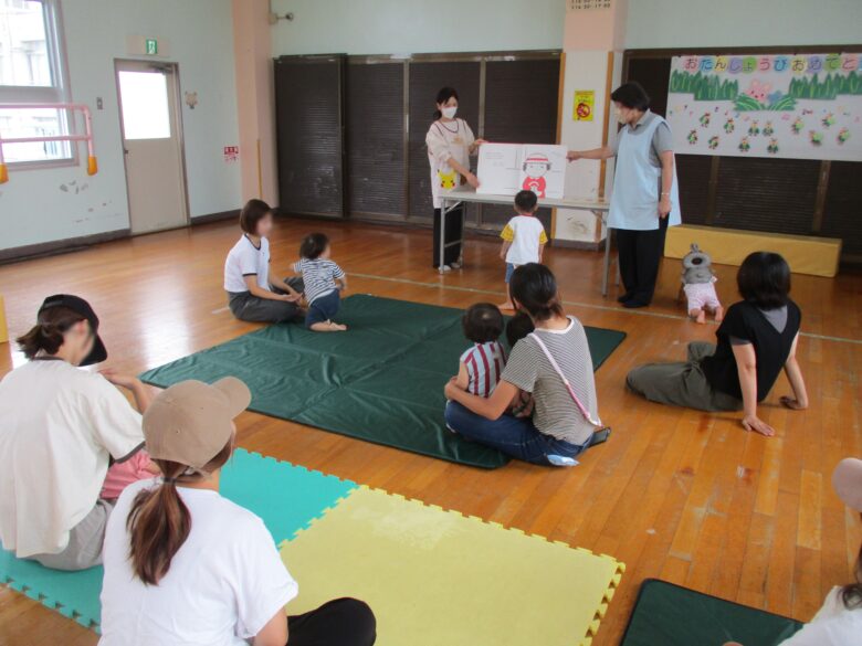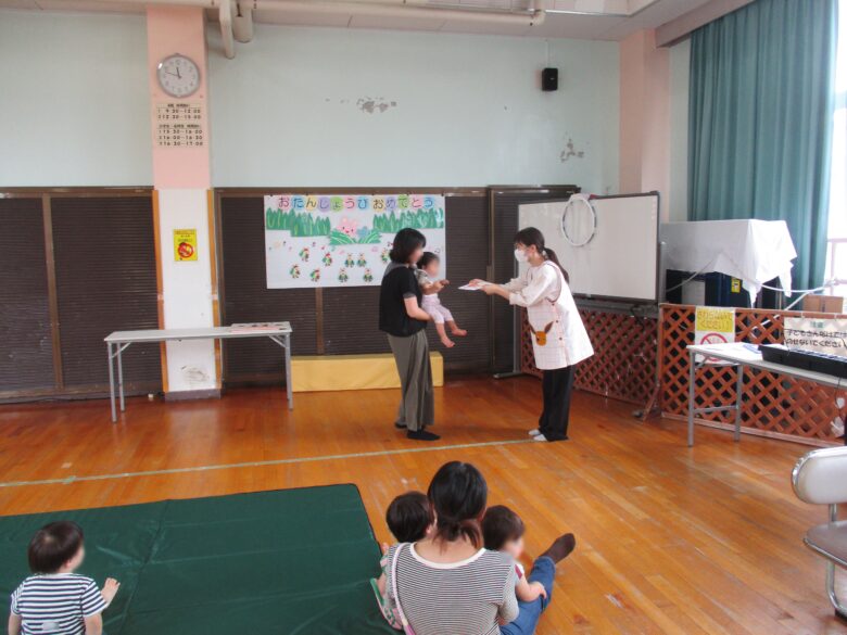 9月25日に9月生まれの子どもたちのお誕生会をしました。今回は大型絵本を2冊読みました。出し物の後はお誕生カード渡しをしました。一人ずつ前に出て来てもらってみんなで「ハッピーバースディ」の歌をその子のために歌ってカードを渡しています。保護者の方と一緒に出でくる子もいますし、少し大きくなると一人で出て来てくれる子もいます。そんなことからもその子の成長を見ることが出来る時間になっています。来月は10月23日です。ぜひお越しください。