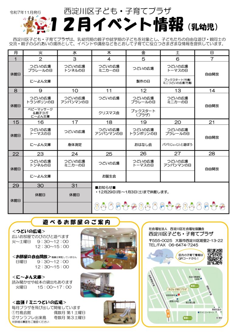 2025年12月号プラザだより 投稿日 2025年11月22日 著者 nishiyodo カテゴリー お知らせ カテゴリー プラザだより 12月のプラザだよりをアップしました。子ども・子育てプラザや各子育て支援施設、区役所等でも配布しています。ぜひ、お立ちよりください♪ イベント情報(乳幼児) 202512_tudoiダウンロード イベント情報(小中高生) 202512_jidoダウンロード